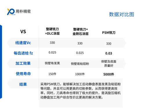 Adopting PSM milling cutter can solve the problems of blackening and sticking of aluminum powder on the surface of the dynamic and static discs after processing, and it can also use higher cutting parameters to obtain higher efficiency, and the tool life has also been greatly improved, which is a more cost-effective solution for the processing of the dynamic and static discs of the scroll compressor.