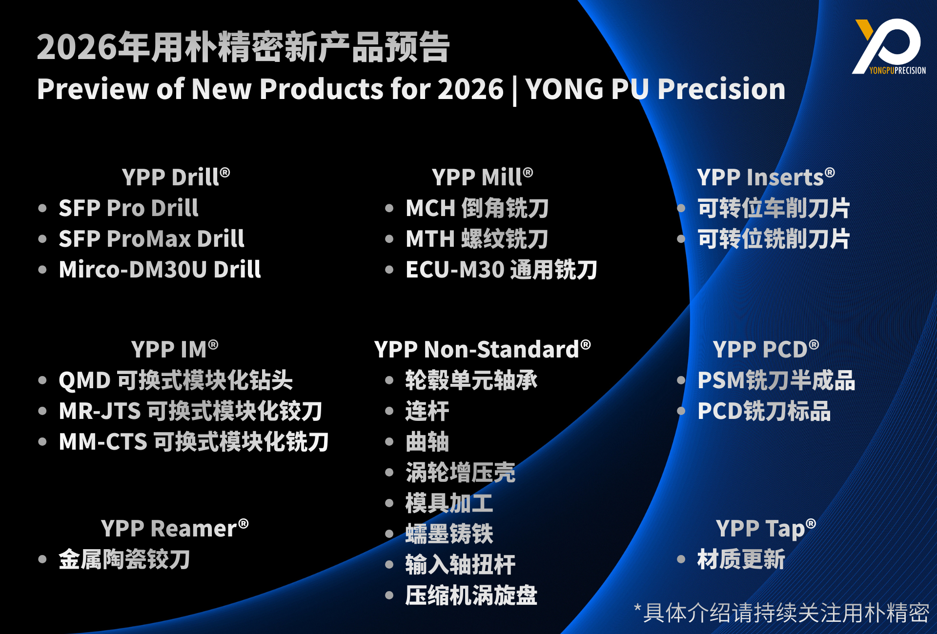 全新升级的YPP Drill®系列,SFP Pro Drill与SFP ProMax Drill双款产品将钻削效率与使用寿命提升至新高度;专攻精密微孔加工的Mirco-DM30U Drill,为微小径加工领域带来突破性解决方案。